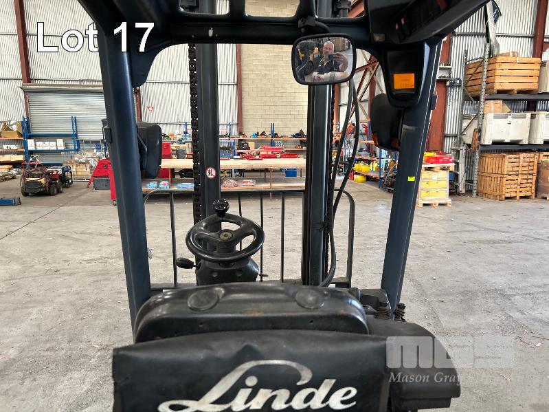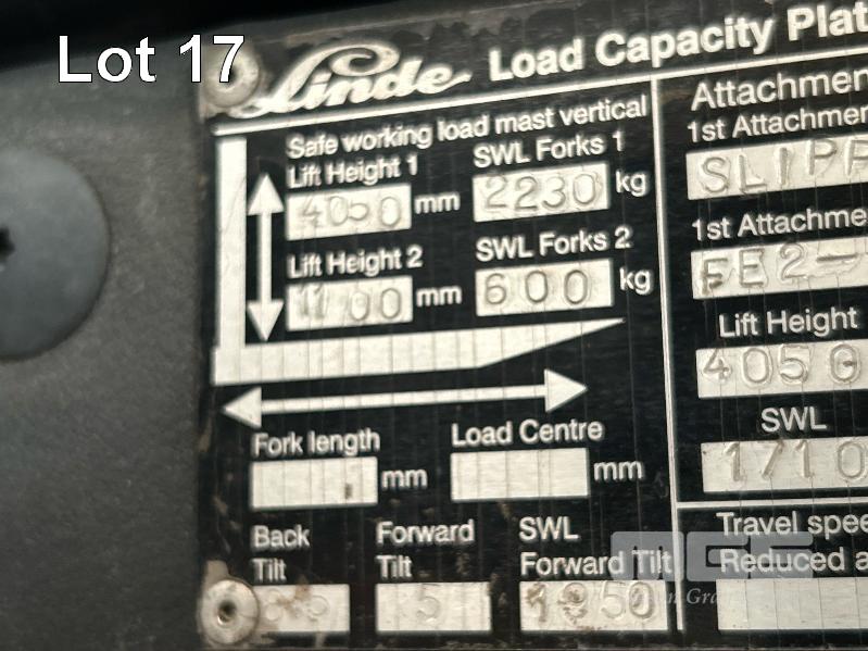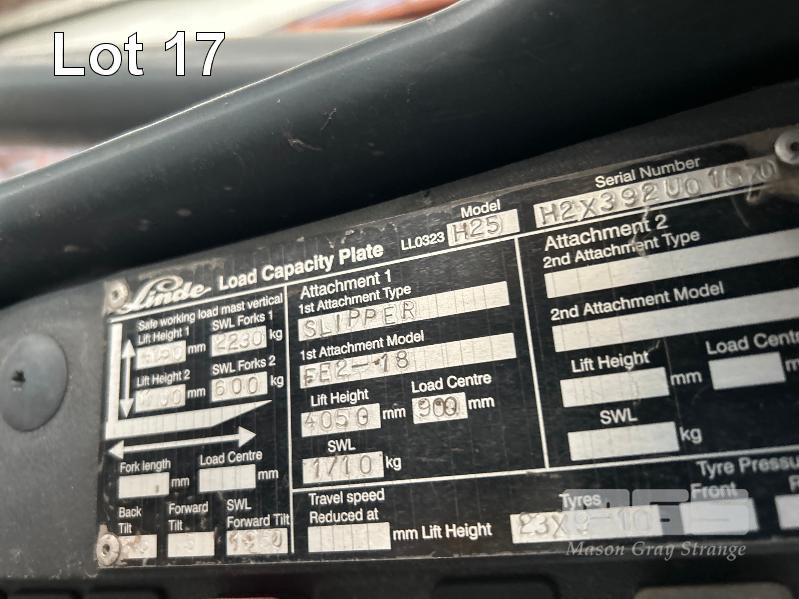2007 FORKLIFT, LINDE MOD: H25T S/NO: H2X392U01570 RATED CAPACITY: 2,500kg SAFE WORK LOAD: 2,230kg MAX LIFT HEIGHT: 4,050mm 4 CYLINDER ENGINE, LPG HOURS: 13,606 SHOWING CLEAR VIEW 2 STAGE MAST KEY #41