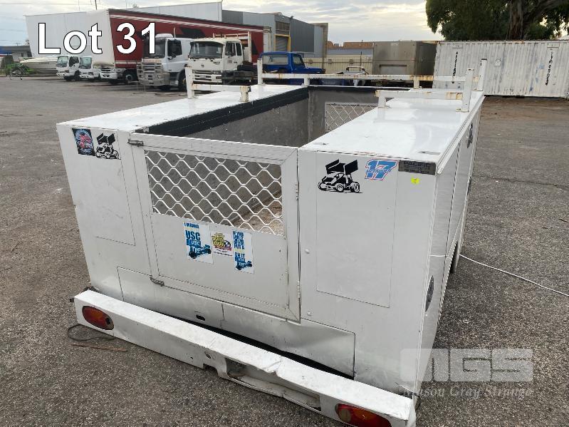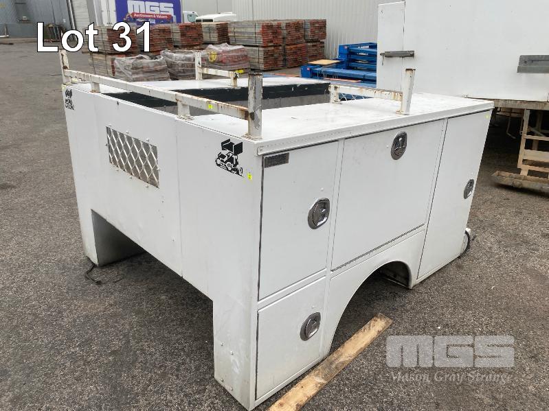 UTILITY TRADE/SERVICE BODY, PACIFIC BODYWORKS WHITE, ALLOY CONSTRUCTION FITTED WITH 7 x ASSORTED STORAGE COMPARTMENTS WITH LOCKABLE DOORS, SLIDE OUT DRAWERS & SHELVING, ROOF RACKS & OPEN CENTRE AREA, 2000 x 850mm TOTAL SIZE OF BODY: 2040 x 1860 x 1150mm (H)