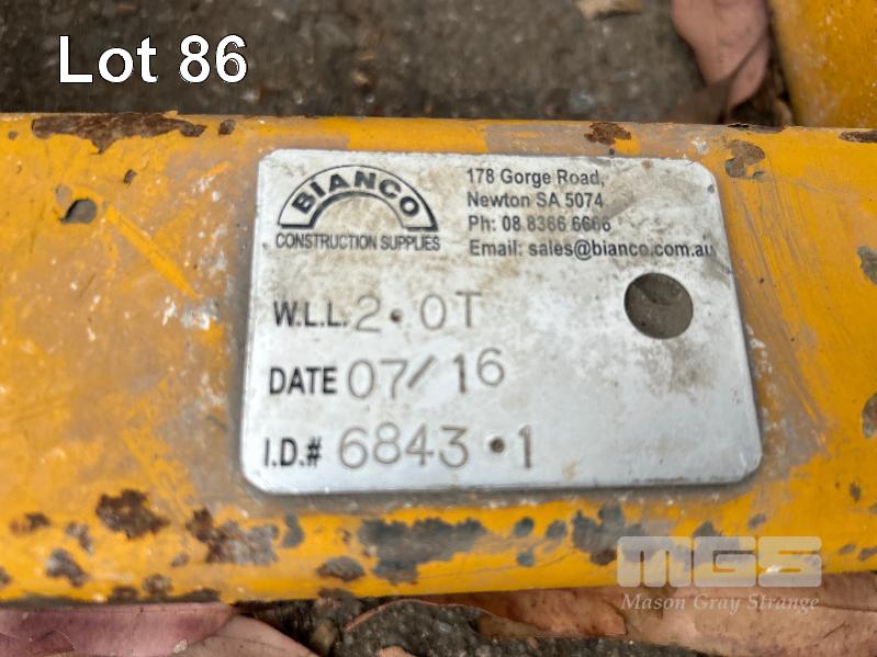 CRANE ATTACHMENT, BIANCO SUIT FORKLIFT WLL: 2 TONNE, REACH: 1,230mm DOM: 2016 WITH SWIVEL HOOK