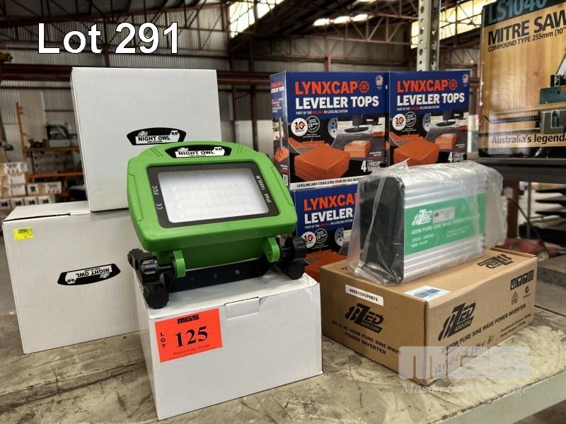 4 x LED WORK LIGHTS, NIGHT OWL RECHARGEABLE, 4 x BOXES LEVELLER TOPS, LYNXCAP & POWER INVERTER 600w, 8ZED, PURE SINE WAVE, 12V DC TO 240V AC AS NEW