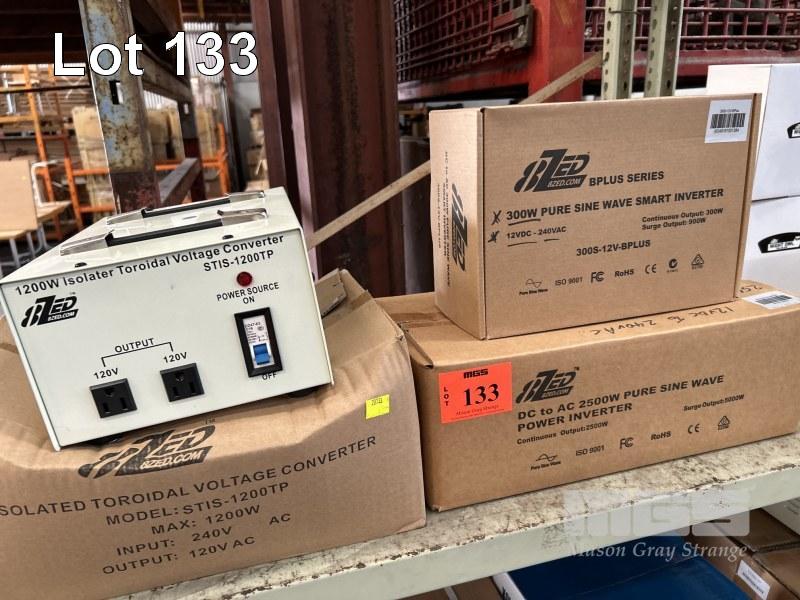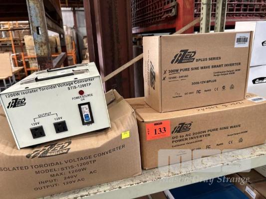 POWER INVERTERS, 8ZED,PURE SINE WAVE 300w, 12VDC TO 240VAC 2500w, 12VDC TO 240VAC & VOLTAGE CONVERTER, TOROIDAL 1200w, 240VAC TO 120VAC AS NEW