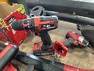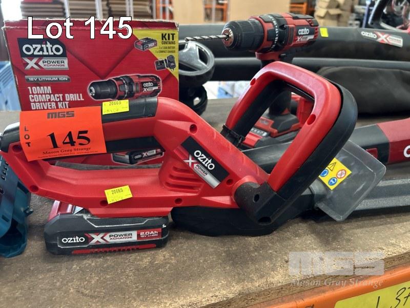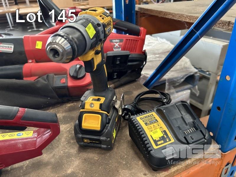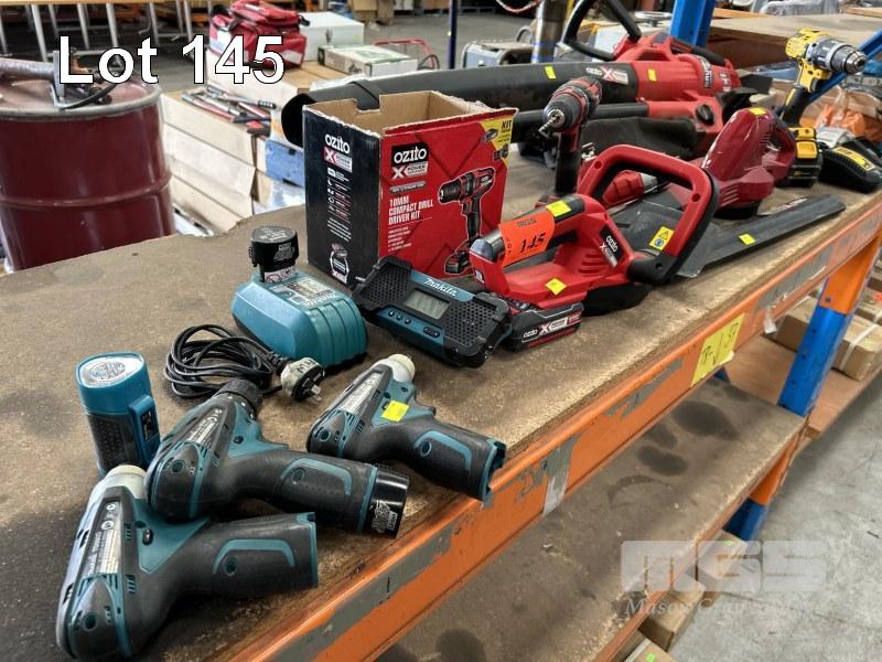 POWER TOOLS INCLUDING MAKITA CORDLESS DRILL, DRIVERS & LIGHTS, TFO90D, TWI00D & DE330D, 2 x BATTERIES & CHARGER, OZITO BRUSH CUTTER, BLOWER, DRILL & DRIVER WITH 2 x BATTERIES, DEWALT DRILL, DCD769 WITH BATTERY & CHARGER