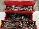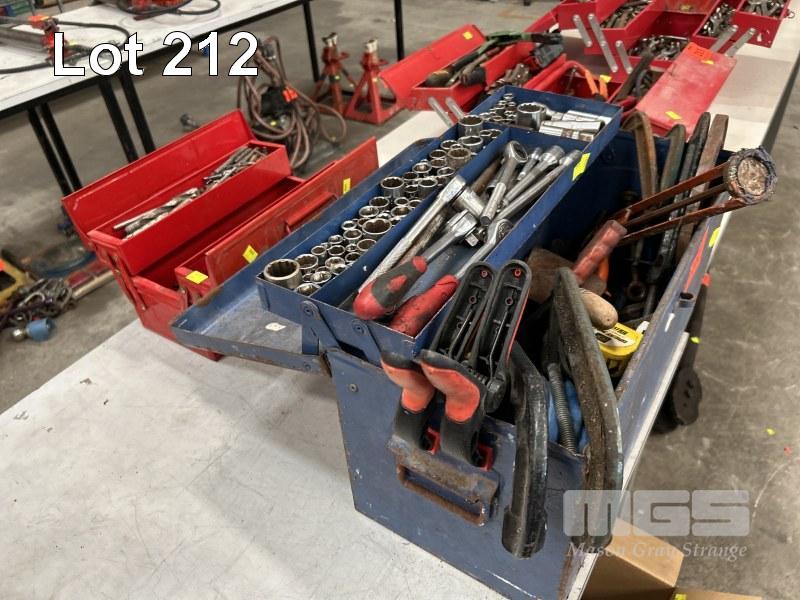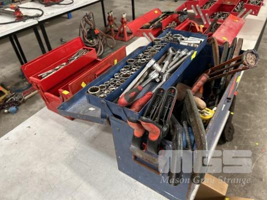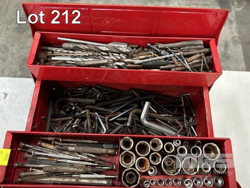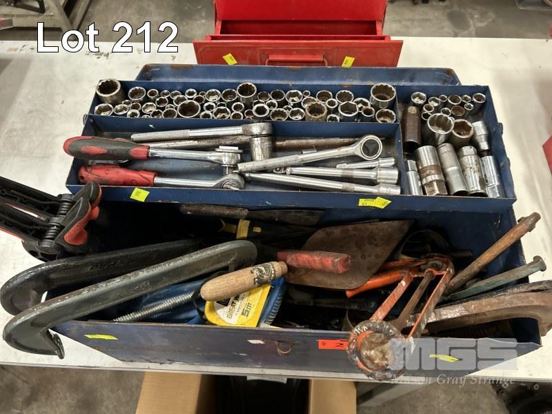 2 x TOOL BOXES, RED & BLUE WITH ASSORTED HAND TOOLS INCLUDING CLAMPS, SOCKET SETS, ALLEN KEYS, DRILL BITS, ETC
