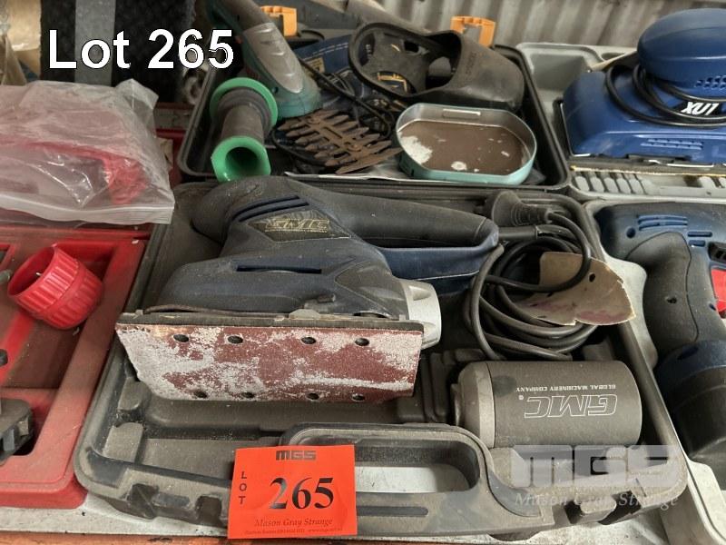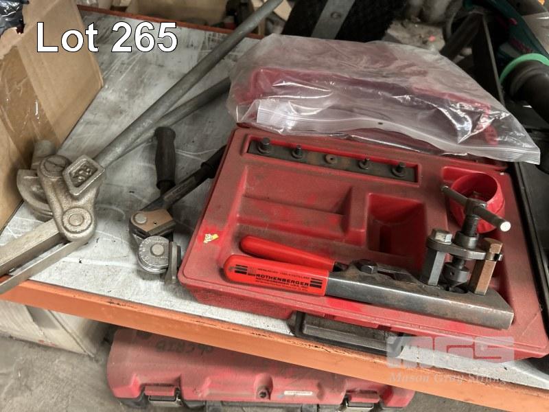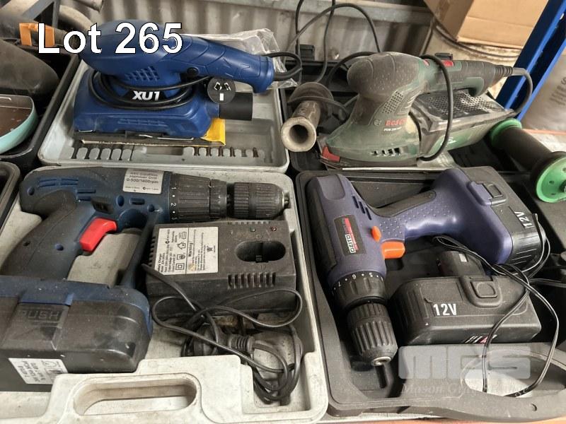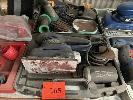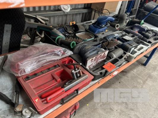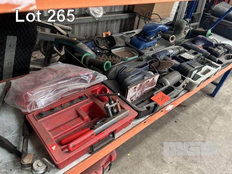 ASSORTED POWER TOOLS INC DRILLS, SANDERS, TRIMMERS, PIPE EXPANSION TOOL & PIPE BENDERS, GLOVES, ETC 1 x SHELF