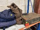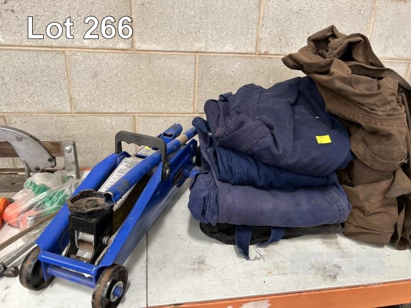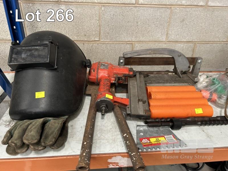 TROLLEY JACK, KINGCROME 1,350kg CAP PNEUMATIC STAPLE/BRAD GUN, MASONRY DRILL BITS, TILE CUTTER, OVERALLS, AMMO BOX, ETC 1 x SHELF