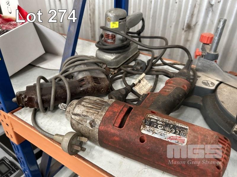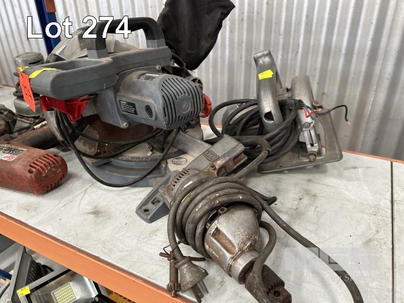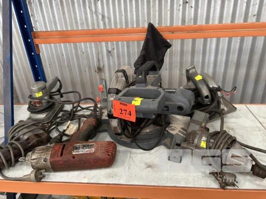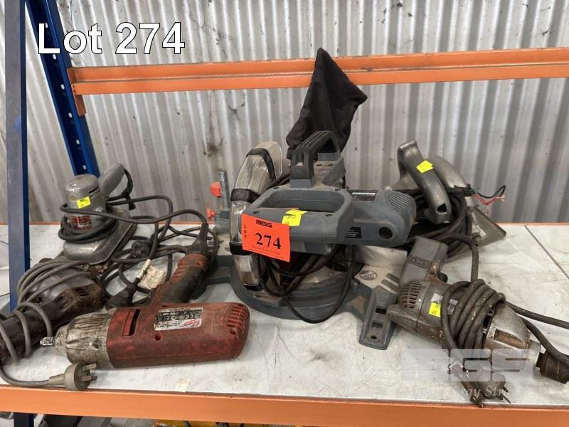 COMPOUND MITRE SAW, OZITO MOD: CMS1621 210mm RATTLE GUN, MILWAUKEE MOD: IPWE400 WITH B&D DRILLS, SANDER & CIRCULAR SAWS 240V