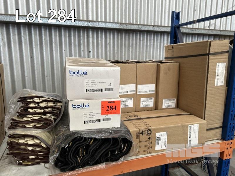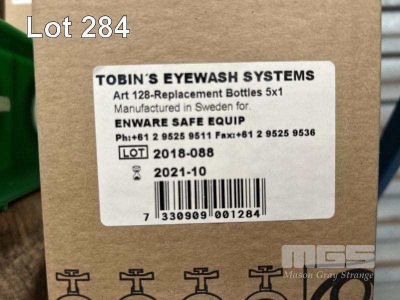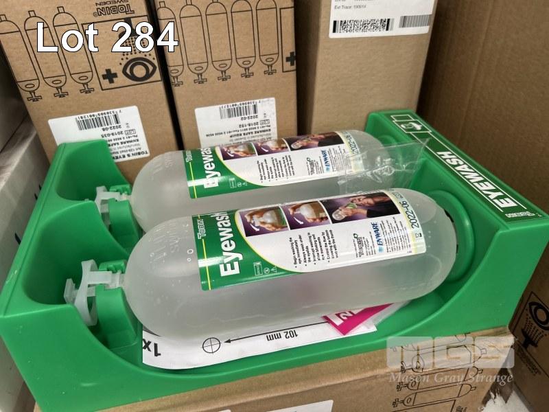 SAFETY EYE WASH SYSTEMS, TOBINS EMERGENCY EYE WASH STATION, WALL MOUNT, TWIN BOTTLE, 4 x UNITS & 5 x REFILLS, SAFETY GOGGLES, BOLLE CLEAR, 2 x BOXES, (5/BOX), 24 x LEATHER GLOVES, SIZE: M 12 x PAIRS WELDERS GLOVES