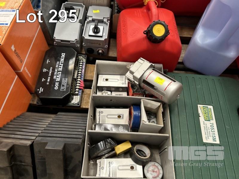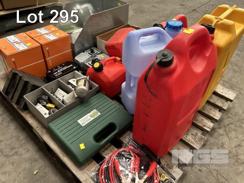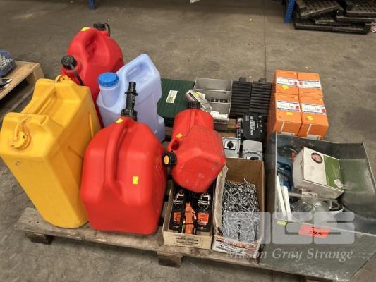6 x JERRY CANS, POLY, 20 TO 5 LITRE, JUMPER CABLES, 2 x WEATHERPROOF GPO'S, CAR STOP WEDGES, MULTI BIT SET, HITACHI, BATH/SHOWER MIXER TAPS, ETC 1 x PALLET