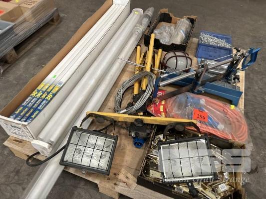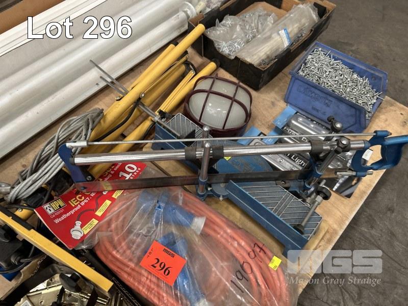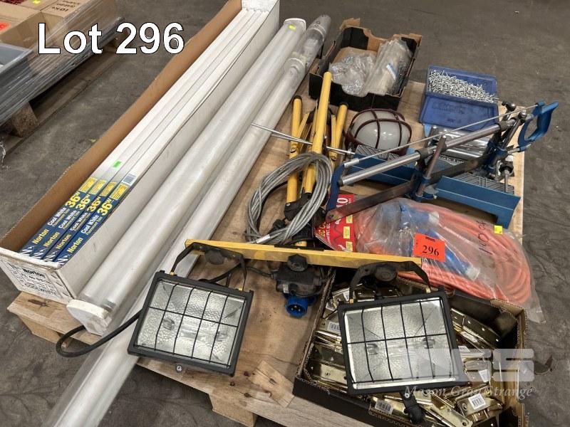 WORK LIGHTS, MITRE GUIDE HAND SAW, 2 x ELECTRICAL EXTENSION LEADS, 10m, 240V IEC 309 PLUG & SOCKET HINGES,FLURO TUBES, ETC 1 x PALLET