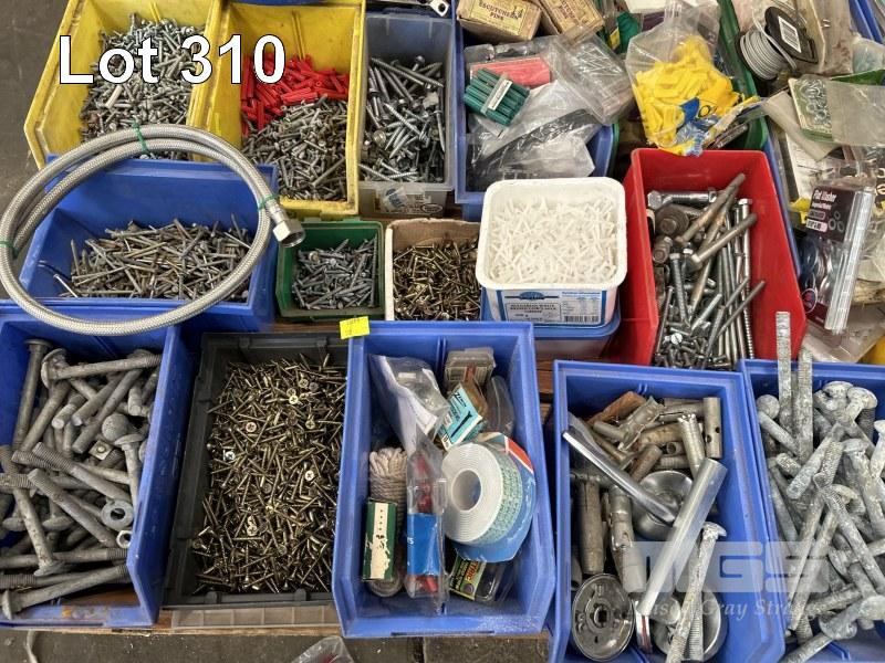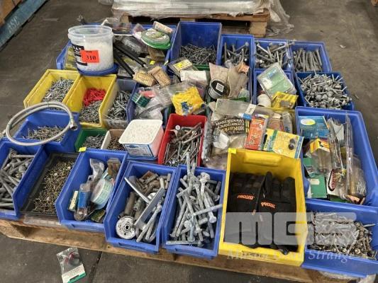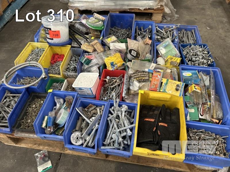 ASSORTED HARDWARE INCLUDING PARTS DRAWERS INCLUDING SCREWS, NUTS & BOLTS, TAPE, WALL PLUGS, NAILS & GAS STRUTS, ETC 1 x PALLET