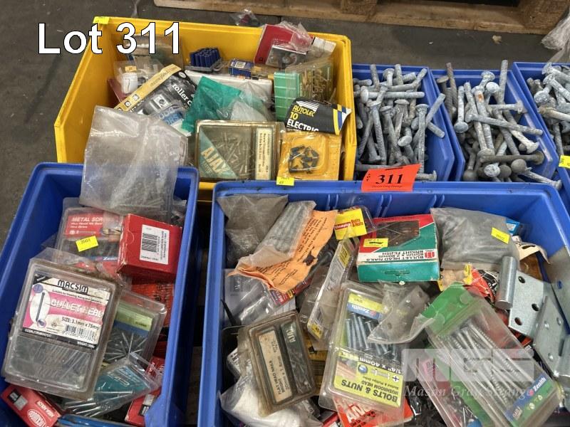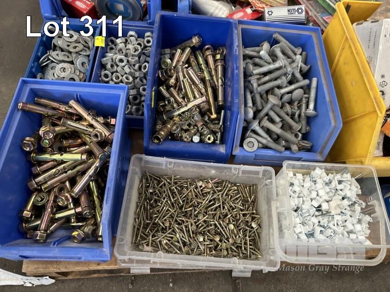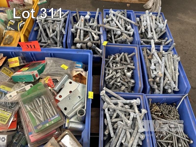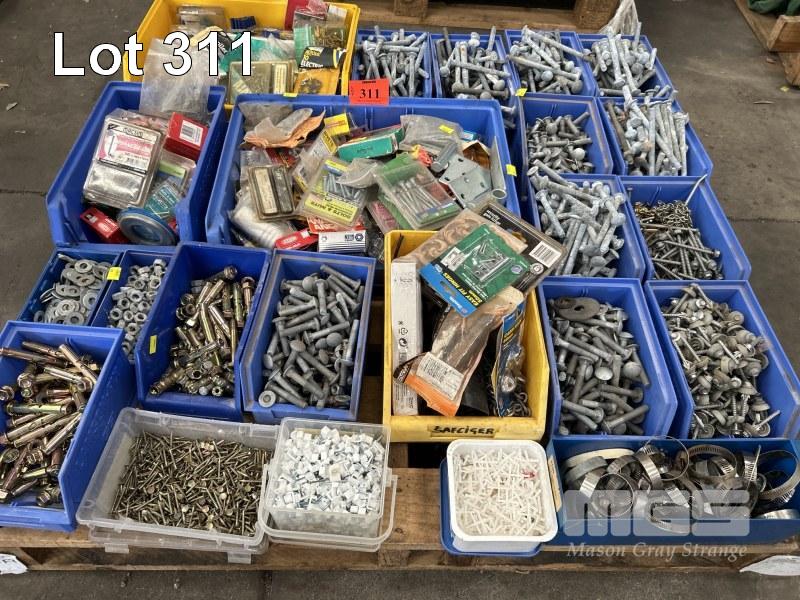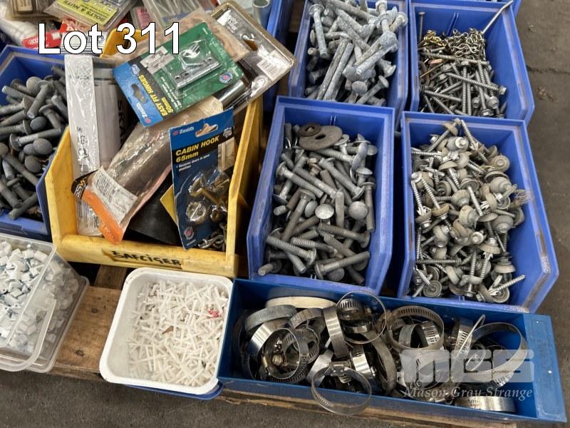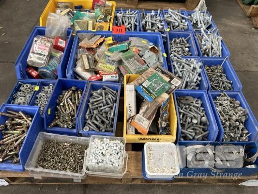 ASSORTED HARDWARE INCLUDING PARTS DRAWERS INCLUDING NUTS & BOLTS, HOSE CLAMPS, NAILS, HINGES & LOCKS 1 x PALLET