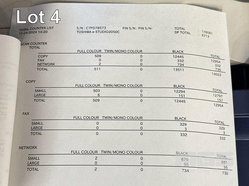 PHOTOCOPIER, TOSHIBA e-STUDIO 2050C COLOUR DIGITAL, ADF, PRINTER USB & NETWORK PORTS, 4,801 COLOUR & 173,780 B&W COPIES SHOWING (TEST PAGE ATTACHED) WITH SPARE TONER CARTRIDGES S/N:C7FD78573
