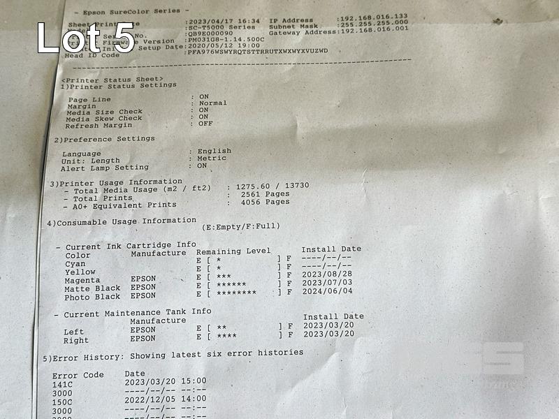 EPSON SURECOLOR T5000 36" WIDE FORMAT PRINTER, 1,275 M2 MEDIA USAGE, 2,561 PAGES (TEST PAGE ATTACHED) WITH SPARE INK CARTRIDGES (EXPIRED) & SPARE PAPER ROLL SPINDLE S/N:QB9E000090