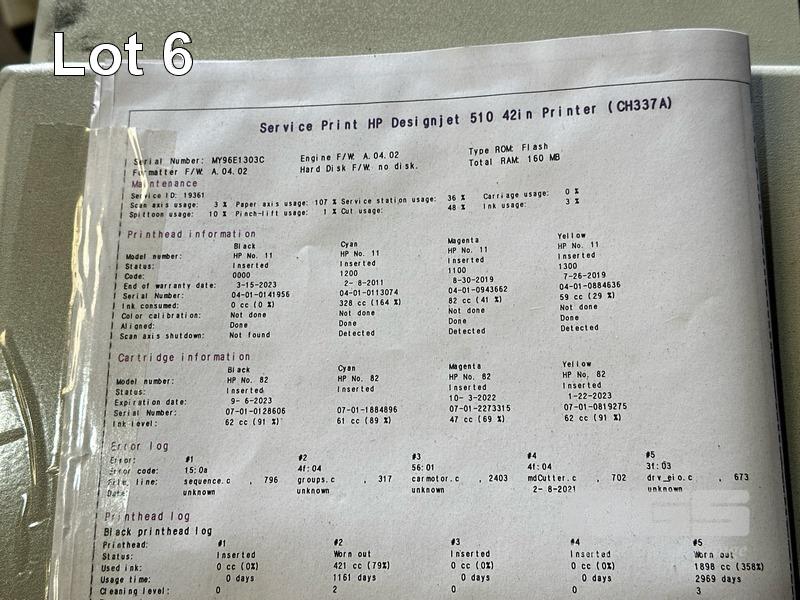 HP DESIGNJET 510 42" WIDE FORMAT PRINTER, MODEL CH337A (TEST PAGE ATTACHED) S/N:MY96E1303C