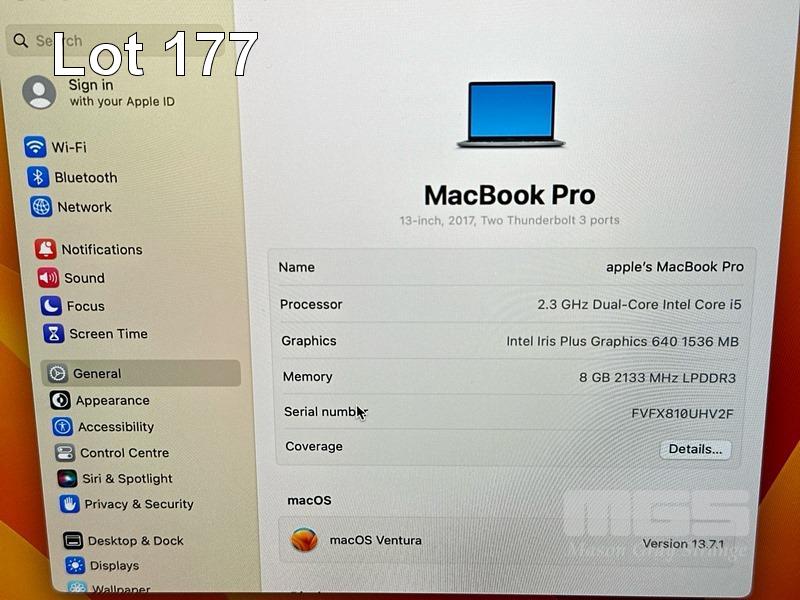 LAPTOP, APPLE MACBOOK PRO (A1708), CORE i5 7360U (7TH GEN) @ 2.3GHz, 8GB DDR3 RAM, 512GB SSD, 13.3" RETINA DISPLAY (2560x1600), INTEL IRIS PLUS GRAPHICS 640, Wi-Fi, BLUETOOTH, MAC OS 13 INSTALLED & USB-C POWER SUPPLY S/N:FVFX810UHV2F