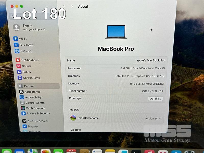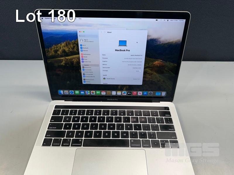 LAPTOP, APPLE MACBOOK PRO (A1989), CORE i5 8279U (8TH GEN) @ 2.4GHz, 16GB DDR3 RAM, 2TB SSD, 13.3" RETINA DISPLAY (2560x1600), INTEL IRIS PLUS GRAPHICS 655, Wi-Fi, BLUETOOTH, MAC OS 14 INSTALLED (NO USB-C POWER SUPPLY) (NOTE: TOUCHBAR FAULT, MARKS ON SCREEN) S/N:C02ZN0L1LVDP
