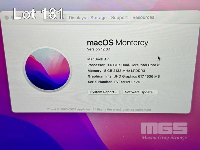 LAPTOP, APPLE MACBOOK AIR (A1932), CORE i5 8210Y (8TH GEN) @ 1.6GHz, 8GB DDR3 RAM, 256GB SSD, 13.3" RETINA DISPLAY (2560x1600), INTEL UHD GRAPHICS 617, Wi-Fi, BLUETOOTH, MAC OS 12 INSTALLED (NO USB-C POWER SUPPLY) S/N:FVFXV12UJK7D