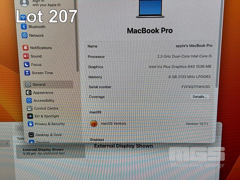 LAPTOP, APPLE MACBOOK PRO (A1708), CORE i5 7360U (7TH GEN) @ 2.3GHz, 8GB DDR3 RAM, 256GB SSD, 13.3" RETINA DISPLAY (2560x1600), INTEL IRIS PLUS GRAPHICS 640, Wi-Fi, BLUETOOTH, MAC OS 13 INSTALLED (NO USB-C POWER SUPPLY) (NOTE: FAULTY SCREEN BACKLIGHT, MARKS ON SCREEN) S/N:FVFXQ1THHV2D