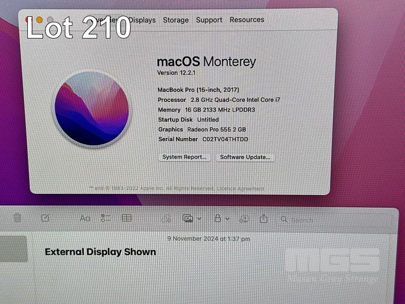 LAPTOP, APPLE MACBOOK PRO (A1707), CORE i7 7700HQ (7TH GEN) @ 2.8GHz, 16GB DDR3 RAM, 512GB SSD, 15.4" RETINA DISPLAY (2880x1800), 2GB RADEON PRO 555 VIDEO, Wi-Fi, BLUETOOTH, MAC OS 12 INSTALLED (NO USB-C POWER SUPPLY) (NOTE: FAULTY SCREEN - NO DISPLAY, SOME KEYS WORN) S/N:C02TV04THTDD
