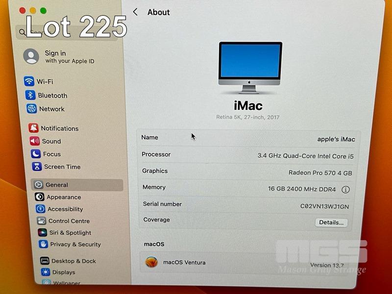 APPLE iMAC (A1419), CORE i5 7500 (7TH GEN) @ 3.4GHz, 16GB DDR4 RAM, 256GB SSD, BUILT-IN 27" RETINA 5K DISPLAY (5120x2880), 4GB RADEON PRO 570 VIDEO, Wi-Fi, BLUETOOTH, MAC OS 13 INSTALLED, CORDLESS KEYBOARD (A1843) & MOUSE (A1657) S/N:C02VN13WJ1GN