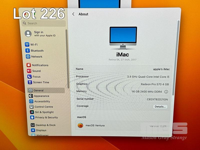 APPLE iMAC (A1419), CORE i5 7500 (7TH GEN) @ 3.4GHz, 16GB DDR4 RAM, 1TB SSD, BUILT-IN 27" RETINA 5K DISPLAY (5120x2880), 4GB RADEON PRO 570 VIDEO, Wi-Fi, BLUETOOTH, MAC OS 13 INSTALLED (NO KEYBOARD, NO MOUSE) S/N:C02XT02DJ1GN