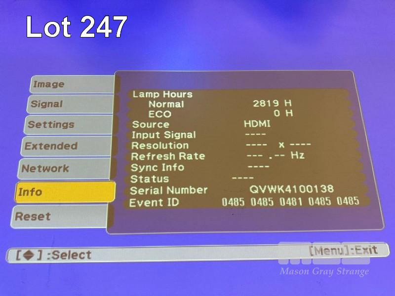 PROJECTOR, EPSON EB-470 ULTRA SHORT THROW 3LCD, 2,600 LUMENS, 2,819 NORMAL HOURS SHOWING WITH REMOTE & BRACKET S/N:QVWK4100138