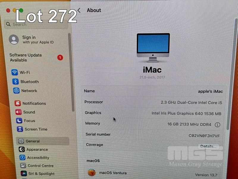APPLE iMAC (A1418), CORE i5 7360U (7TH GEN) @ 2.3GHz, 16GB DDR4 RAM, 256GB SSD, BUILT-IN 21.5" DISPLAY (1920x1080), INTEL IRIS PLUS GRAPHICS 640, Wi-Fi, BLUETOOTH, MAC OS 13 INSTALLED (NO KEYBOARD, NO MOUSE) S/N:C02VN0FJH7VF