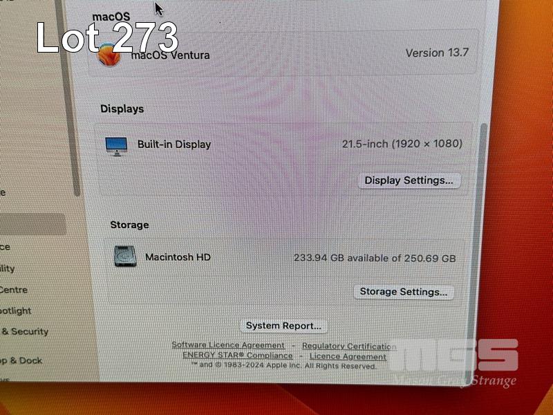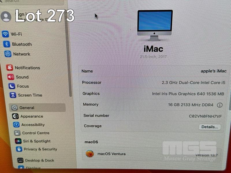APPLE iMAC (A1418), CORE i5 7360U (7TH GEN) @ 2.3GHz, 16GB DDR4 RAM, 256GB SSD, BUILT-IN 21.5" DISPLAY (1920x1080), INTEL IRIS PLUS GRAPHICS 640, Wi-Fi, BLUETOOTH, MAC OS 13 INSTALLED (NO KEYBOARD, NO MOUSE) S/N:C02VN0FNH7VF