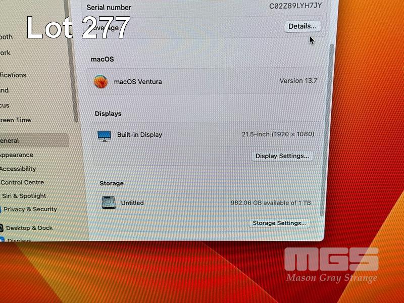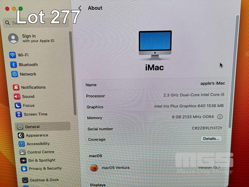 APPLE iMAC (A1418), CORE i5 7360U (7TH GEN) @ 2.3GHz, 8GB DDR4 RAM, 1TB SATA HDD, BUILT-IN 21.5" DISPLAY (1920x1080), INTEL IRIS PLUS GRAPHICS 640, Wi-Fi, BLUETOOTH, MAC OS 13 INSTALLED (NO KEYBOARD, NO MOUSE) S/N:C02Z89LYH7JY