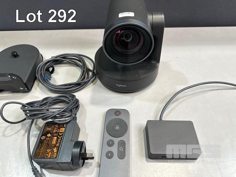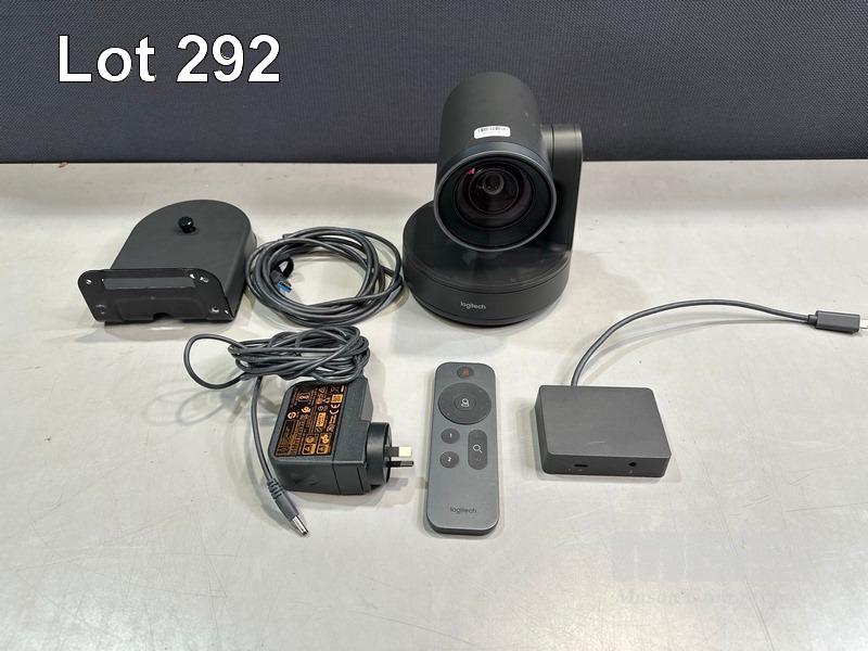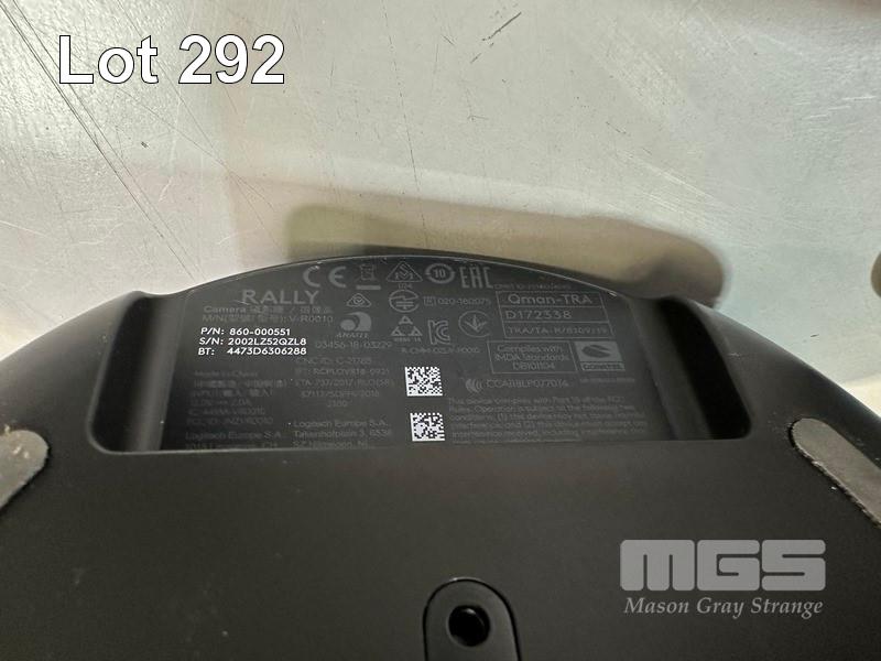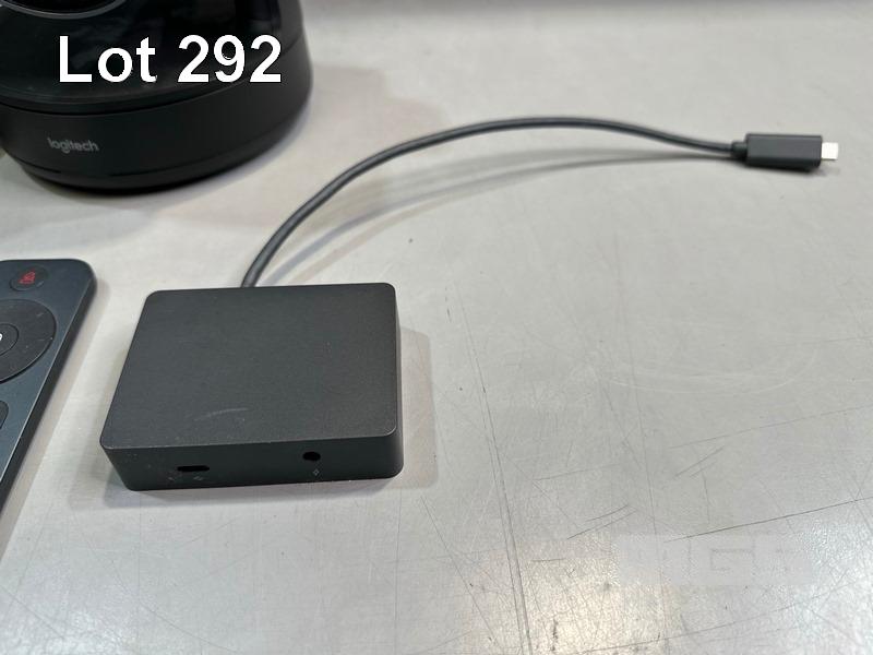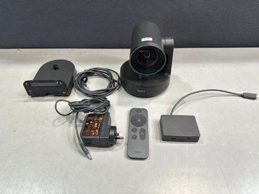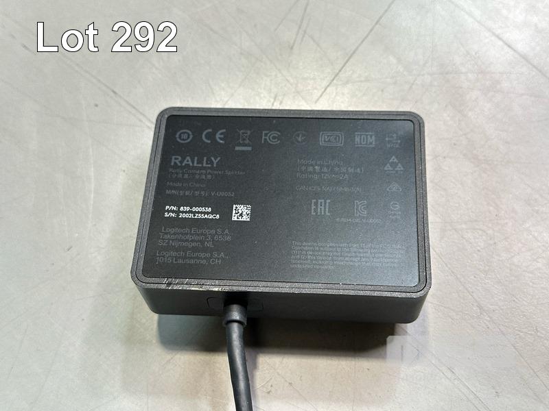 LOGITECH RALLY ULTRA HD PTZ CAMERA, MODEL V-R0010 WITH REMOTE, RALLY CAMERA POWER SPLITTER, POWER SUPPLY & USB-C CABLE S/N:2002LZ52QZL8