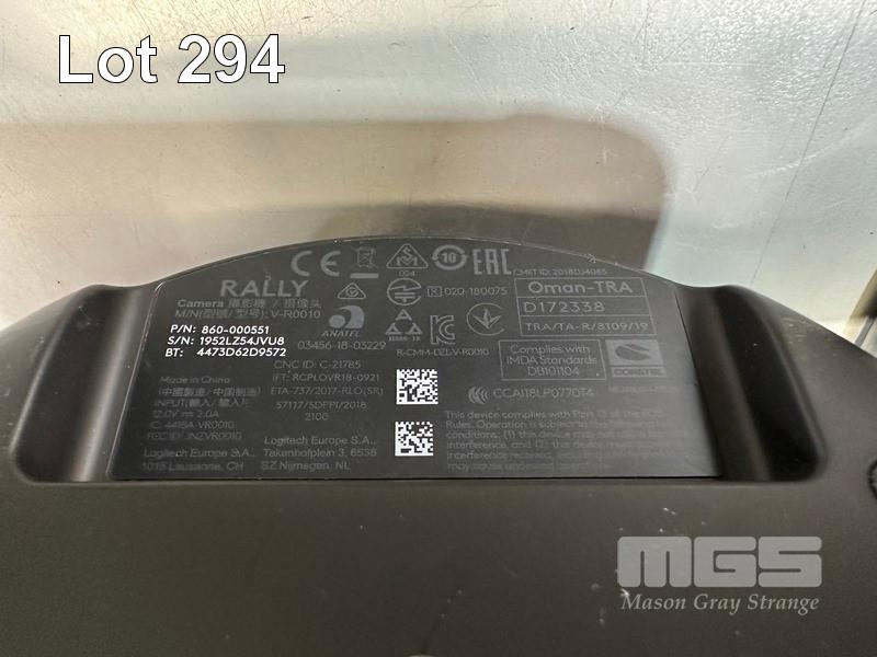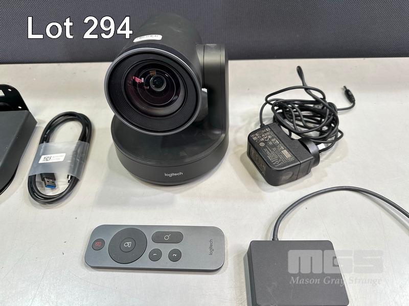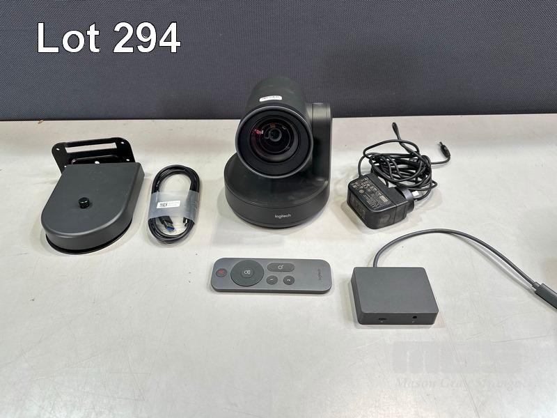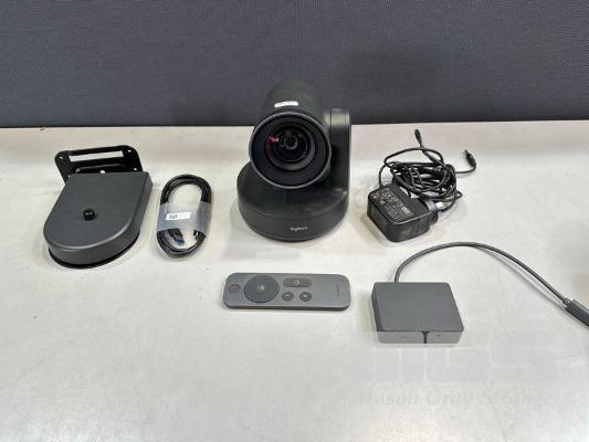 LOGITECH RALLY ULTRA HD PTZ CAMERA, MODEL V-R0010 WITH REMOTE, RALLY CAMERA POWER SPLITTER, POWER SUPPLY & USB-C CABLE S/N:1952LZ54JVU8