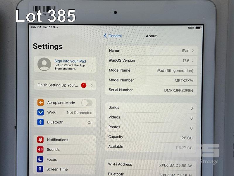 APPLE iPAD 6TH GEN, 128GB, Wi-Fi, SILVER, MODEL MR7K2X/A, A1893 WITH COVER (NO CABLE, NO CHARGER) S/N:DMPXJFPZJF8N