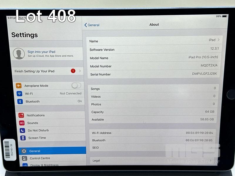 APPLE iPAD PRO, 10.5", 64GB, Wi-Fi, SPACE GREY, MQDT2X/A, MODEL A1701 WITH KEYBOARD COVER (NO CABLE, NO CHARGER) (NOTE: BRIGHT SPOT ON SCREEN) S/N:DMPVLGF2J28K