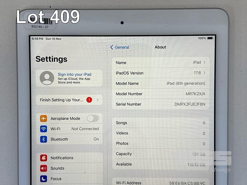 APPLE iPAD 6TH GEN, 128GB, Wi-Fi, SILVER, MODEL MR7K2X/A, A1893 (NO CABLE, NO CHARGER) S/N:DMPXJFUEJF8N