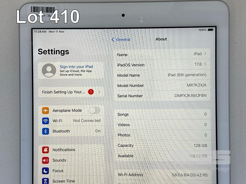 APPLE iPAD 6TH GEN, 128GB, Wi-Fi, SILVER, MODEL MR7K2X/A, A1893 (NO CABLE, NO CHARGER) S/N:DMPXJKAMJF8N