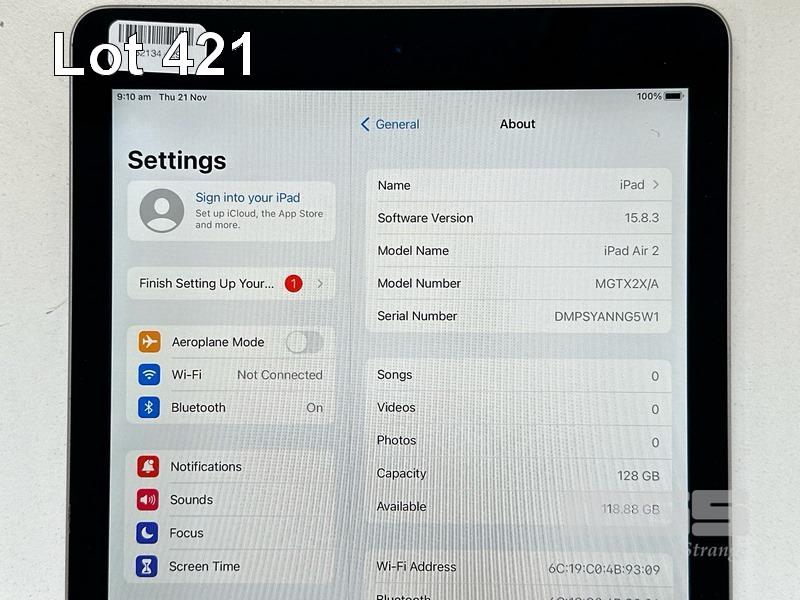 APPLE iPAD AIR 2, 128GB, Wi-Fi, SPACE GREY, MODEL MGTX2X/A, A1566 (NO CABLE, NO CHARGER) S/N:DMPSYANNG5W1