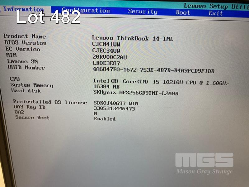 LAPTOP, LENOVO THINKBOOK 14-IML, TYPE 20RV, CORE i5 10210U (10TH GEN) @ 1.6GHz, 16GB DDR4 RAM, 256GB NVMe M.2 SSD, 14" WIDESCREEN (1920x1080), INTEL UHD GRAPHICS, Wi-Fi, BLUETOOTH, WINDOWS 11 PRO INSTALLED & POWER SUPPLY (NOTE: SCRATCHES ON CASING, MINOR MARKS ON SCREEN) S/N:LR0E3E87