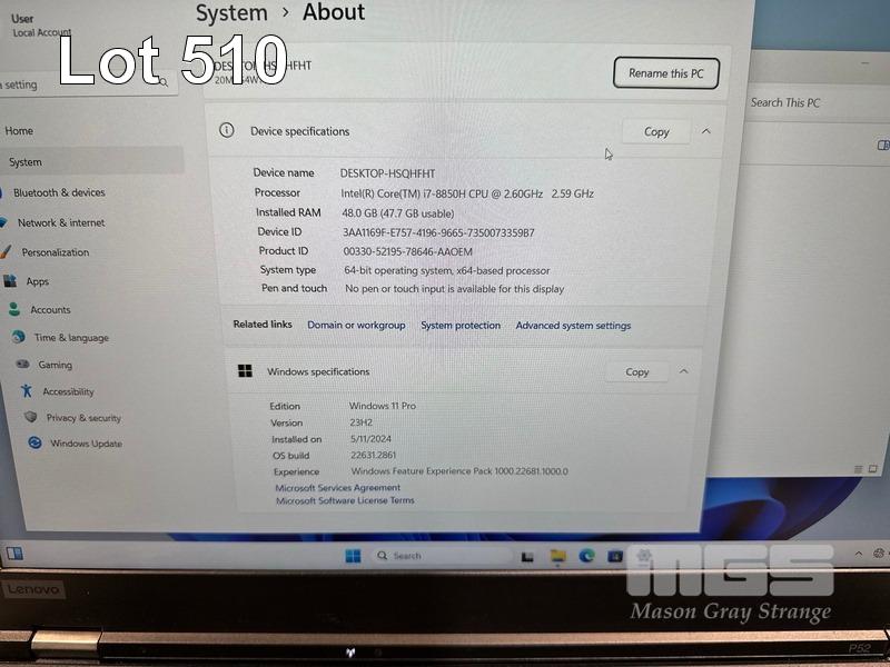 LAPTOP, LENOVO THINKPAD P52 MOBILE WORKSTATION, TYPE 20MA, CORE i7 8850H (8TH GEN) @ 2.6GHz, 48GB DDR4 RAM, 512GB NVMe M.2 SSD, 15.6" WIDESCREEN (1920x1080), 4GB NVIDIA QUADRO P2000 VIDEO, Wi-Fi, BLUETOOTH, WINDOWS 11 PRO INSTALLED & POWER SUPPLY S/N:PF1D7DLS