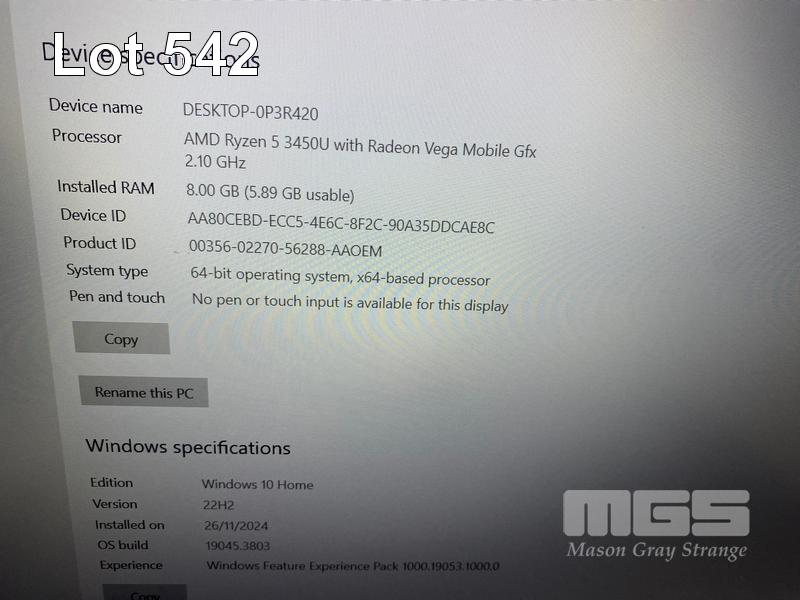 LAPTOP, DELL INSPIRON 15 3505, AMD RYZEN 5 3450U @ 2.1GHz, 8GB DDR4 RAM, 256GB NVMe M.2 SSD, 15.6" WIDESCREEN (1920x1080), Wi-Fi, BLUETOOTH, WINDOWS 10 HOME INSTALLED & POWER SUPPLY (NOTE: MARKS ON SCREEN) S/N:8PZR073