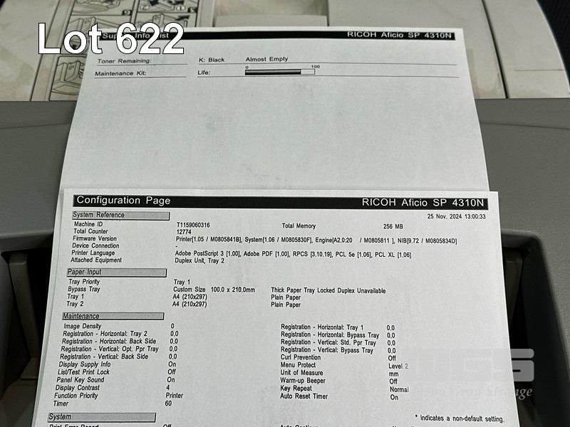 PRINTER, RICOH AFICIO SP4310N LASER, USB, NETWORK, 12,774 PAGES (TEST PAGE ATTACHED) (NOTE: MESSAGE REPLACE PRINT CARTRIDGE SOON) S/N:T1159060316
