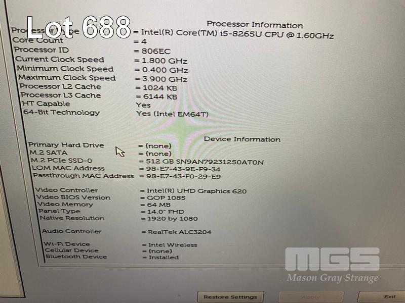 LAPTOP, DELL LATITUDE 5400, CORE i5 8265U (8TH GEN) @ 1.6GHz, 8GB DDR4 RAM, 512GB NVMe M.2 SSD, 14" WIDESCREEN (1920x1080), INTEL UHD GRAPHICS 620, Wi-Fi, BLUETOOTH, WINDOWS 11 HOME INSTALLED (NO POWER SUPPLY) (NOTE: MARKS ON SCREEN, BATTERY NOT HOLDING CHARGE, BATTERY SWOLLEN) S/N:62LX2Z2