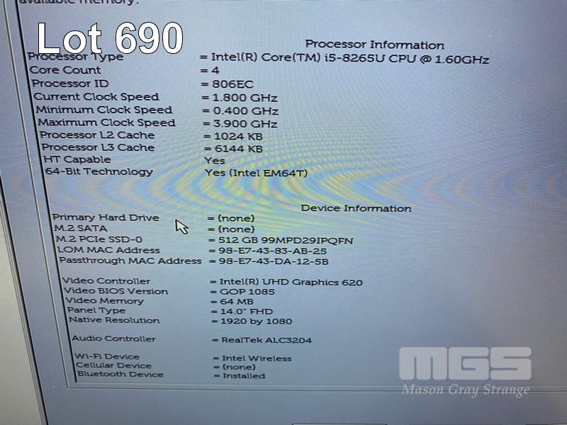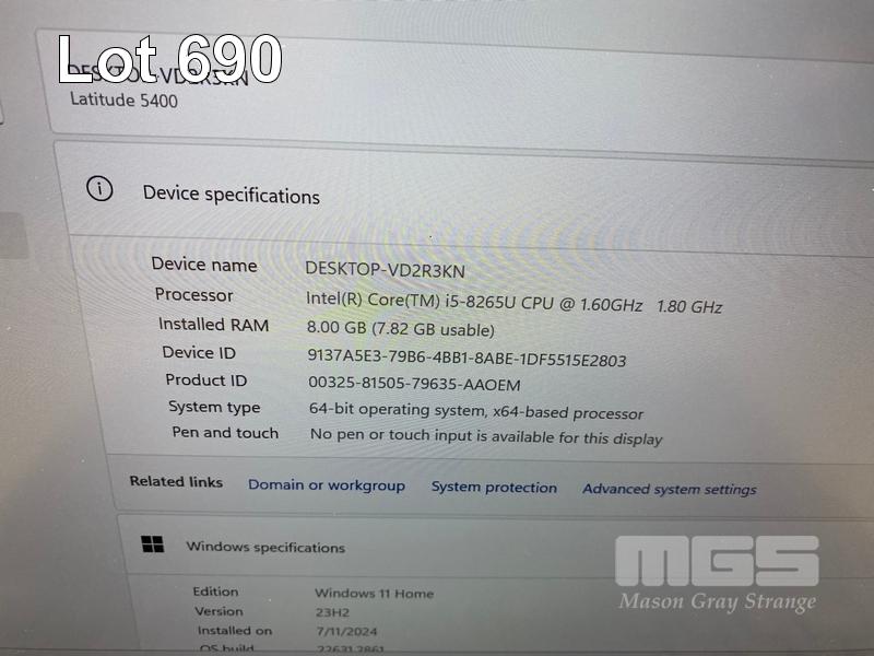 LAPTOP, DELL LATITUDE 5400, CORE i5 8265U (8TH GEN) @ 1.6GHz, 8GB DDR4 RAM, 512GB NVMe M.2 SSD, 14" WIDESCREEN (1920x1080), INTEL UHD GRAPHICS 620, Wi-Fi, BLUETOOTH, WINDOWS 11 HOME INSTALLED (NO POWER SUPPLY) (NOTE: MARKS ON SCREEN, SMALL DENT IN CASING) S/N:703LYY2
