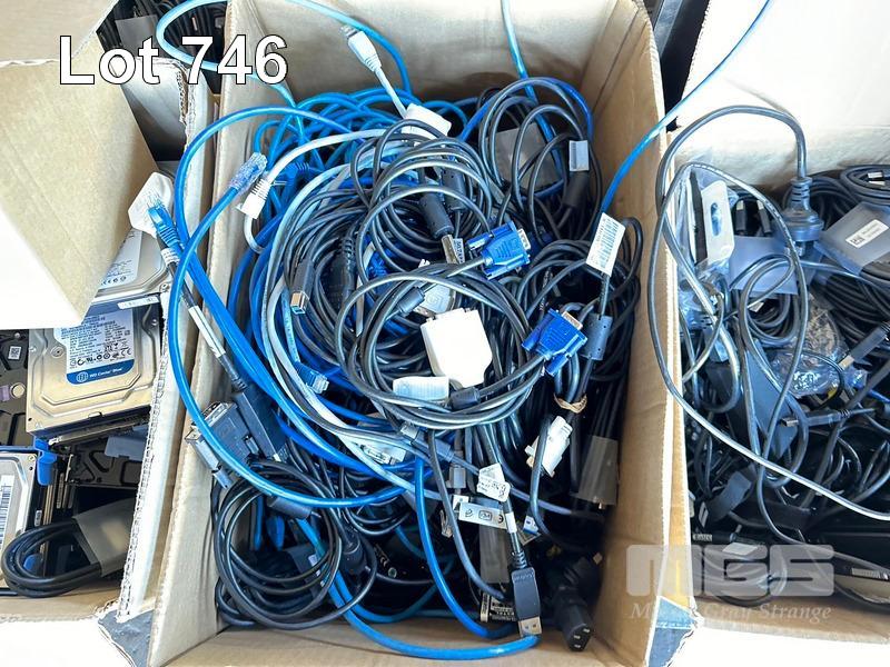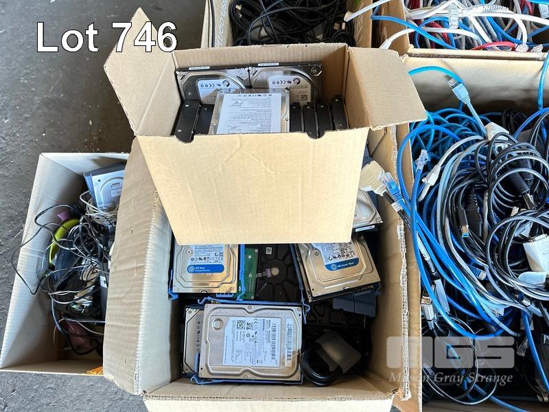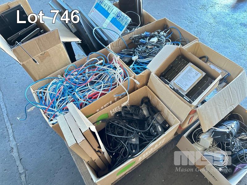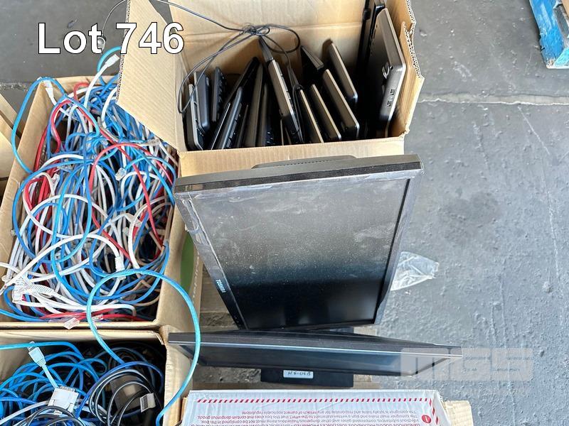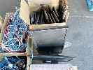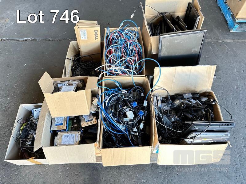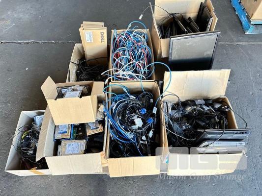 1 x PALLET LOT ASST CABLES, KEYBOARDS, HARD DRIVES, SPEAKERS, USB CABLES, 2 x MONITORS ETC