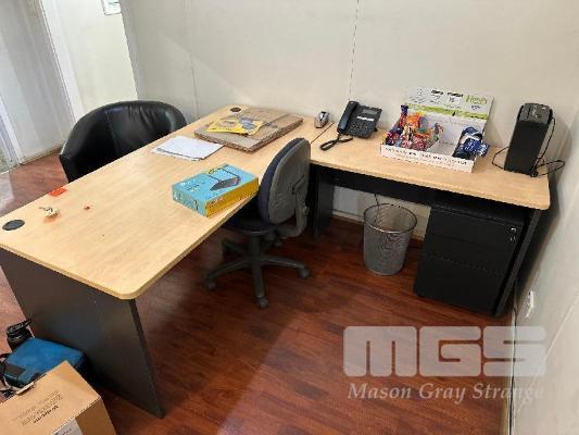 DESK, TIMBER LAMINATE, PINE & CHARCOAL, 1800 x 2000mm WITH RETURN, UNDERDESK MOBILE & GAS LIFT CHAIR
