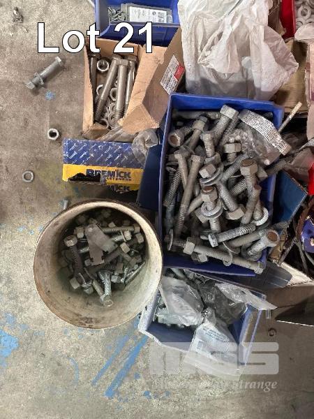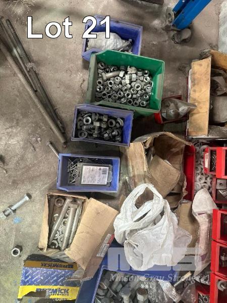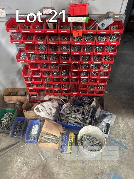 84 BIN RACK & CONTENTS LARGE QUANTITY NUTS, BOLTS & WASHERS, PLUS LOOSE TUBS & GALV BOLTS
