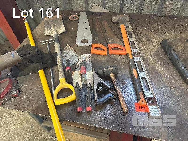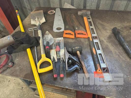ASSORTED HAND TOOLS, TROUGHS, SAWS, LEVEL, MALLET, PLANE, SLEDGE HAMMER