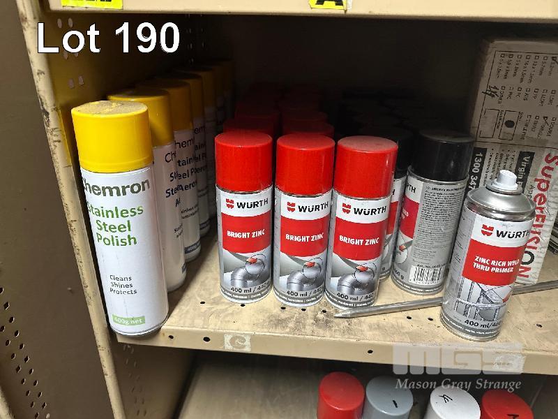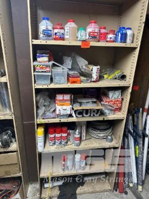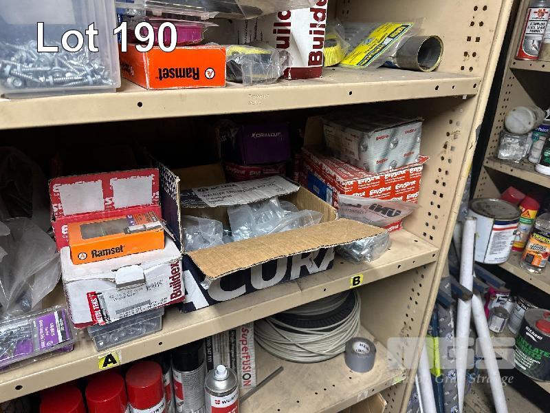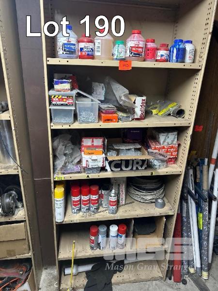 STEEL SHELF UNIT & CONTENTS EZY STRUT FITTINGS, PVC CEMENTS & PRIMING FLUIDS, TEK SCREWS, PAINTS, POLISH, ETC