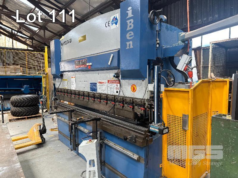 STEEL MASTER HYDRAULIC PRESS BRAKE MOD: 135/3200 CNC2 DOM: 2018 135T/ 3200mm TOOL DECK INCLUDES, 4 WAY TOOL BLOCK & ASSORTED BLADES DSP LASER-TX SAFETY BEAMS, PEDAL CONTROL WITH E/S, POWERED BACK GAUGE ON BALL SCREW THREADS, REAR SAFETY BEAMS