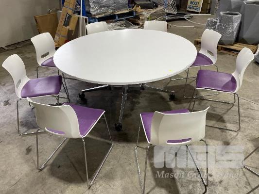 CIRCULAR TABLE, 1700mm (D), TIMBER LAMINATE, MOBILE WITH 8 x CHAIRS, WHITE/PURPLE