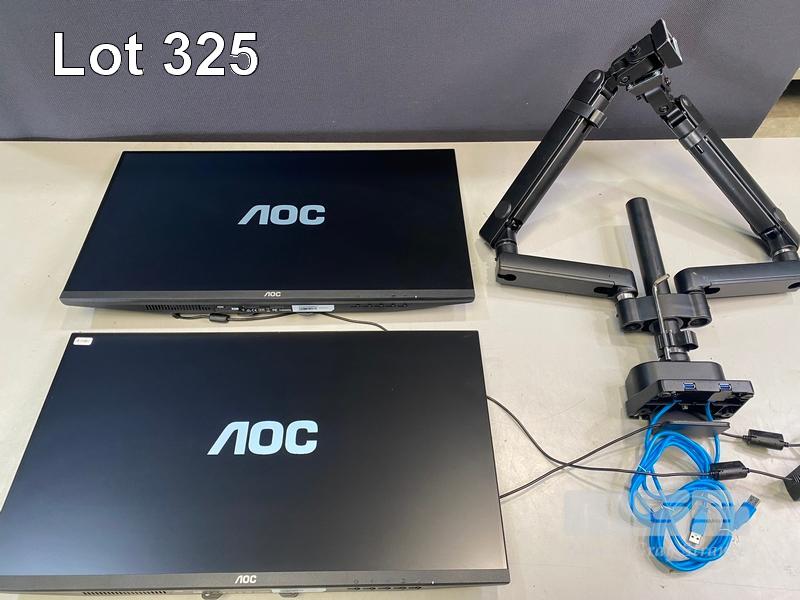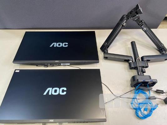 2 x MONITORS, AOC 27B1H2/75 27" IPS WIDESCREEN, HDMI, VGA (WITH CABLES) WITH DUAL DESK MOUNT STAND S/N:ATNP79A001307, ATNP79A001461